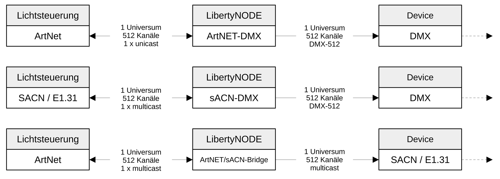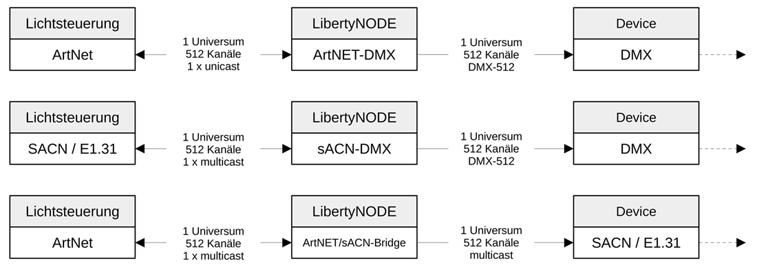 - überträgt theoretisch bis zu bis zu 32.768 Universen (16.777.216 Kanäle)