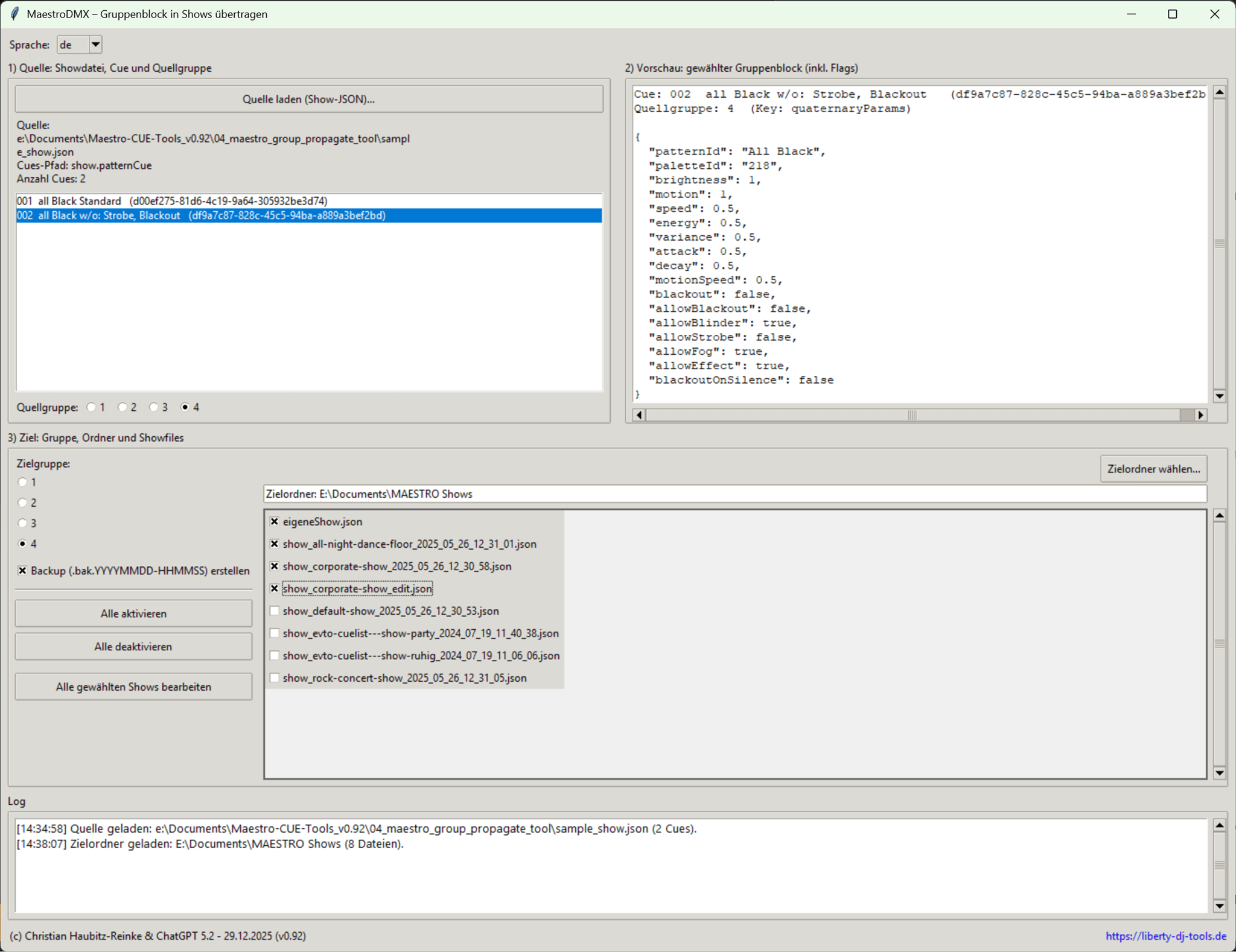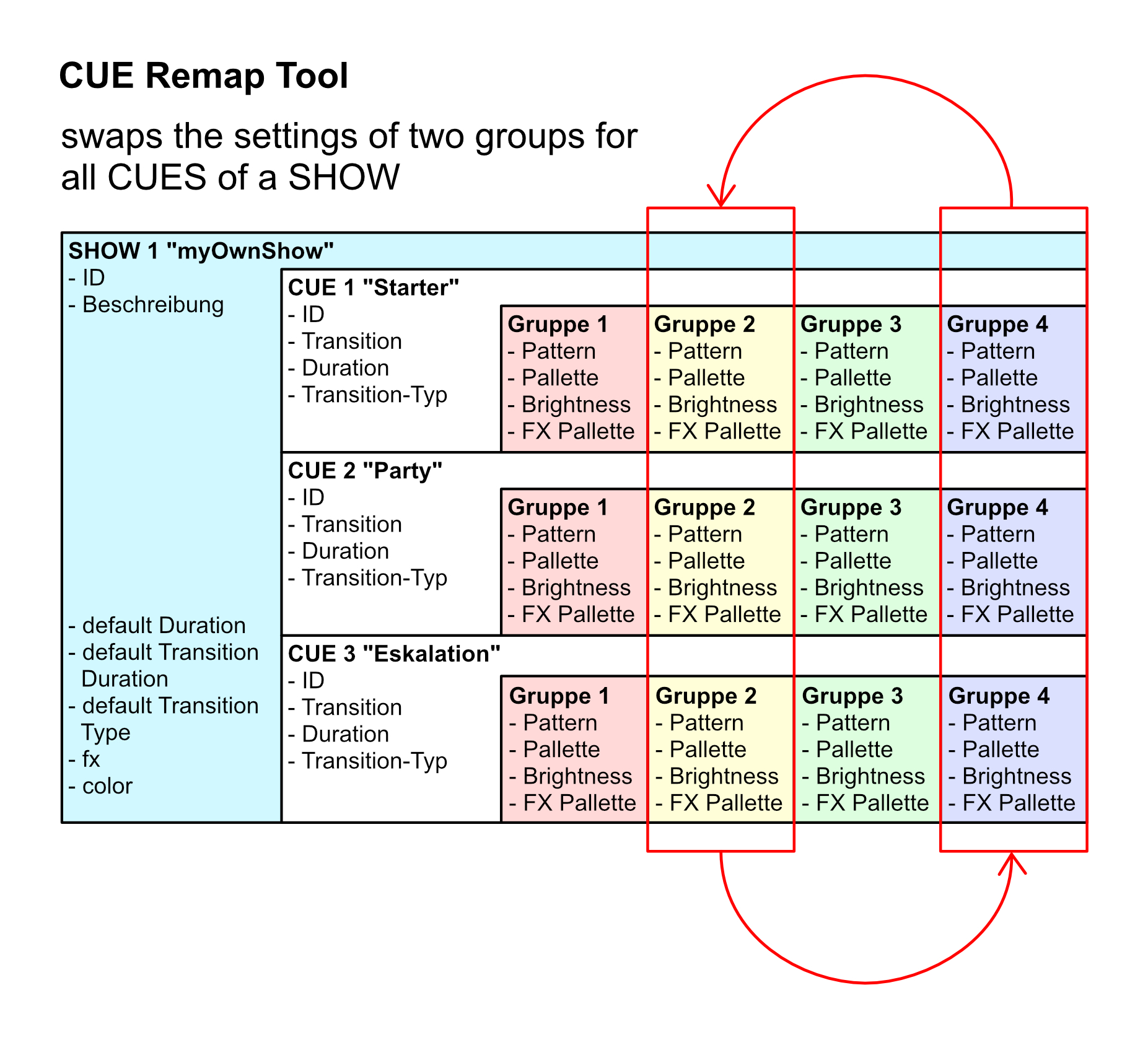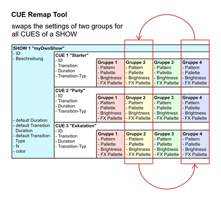 Mit dem Tool nimmst du dir eine fertig eingestellte Gruppe aus einer bestehenden CUE einer Show-Datei und öffnest einen Ordner mit allen zu ändernden Show-Files. Das Tool listet alle Show-Files zur Auswahl auf und du wählst nur noch, welche Dateien verändert werden sollen, und welche Ziel-Gruppe überschrieben werden soll. Das Tool öffnet alle ausgewählten Dateien und überschreibt in ALLEN enthaltenen CUEs die Zielgruppe mit den oben gewählten Einstellungen.