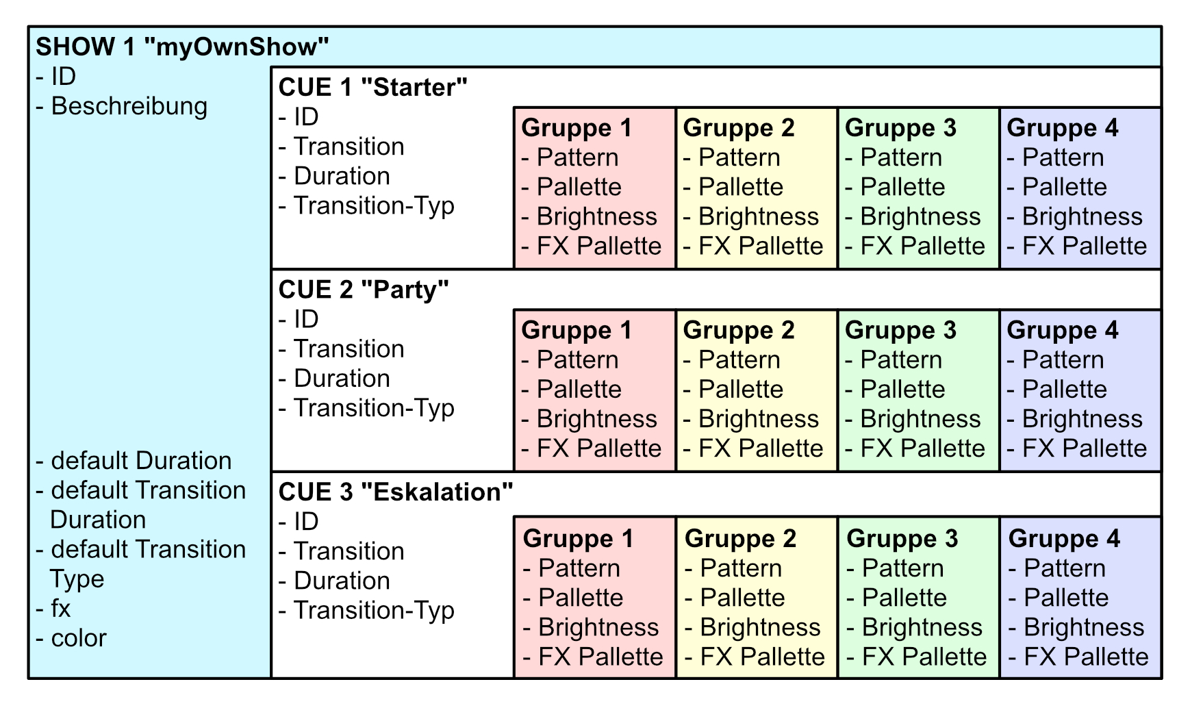 In der SHOW gespeichert sind jeweils die CUEs, jeweils mit einer ID, den Dauer- und Transition-Angaben sowie die eigentlichen Patterns, Color-Pallettes usw., jeweils für jede der 4 Gerätegruppen.