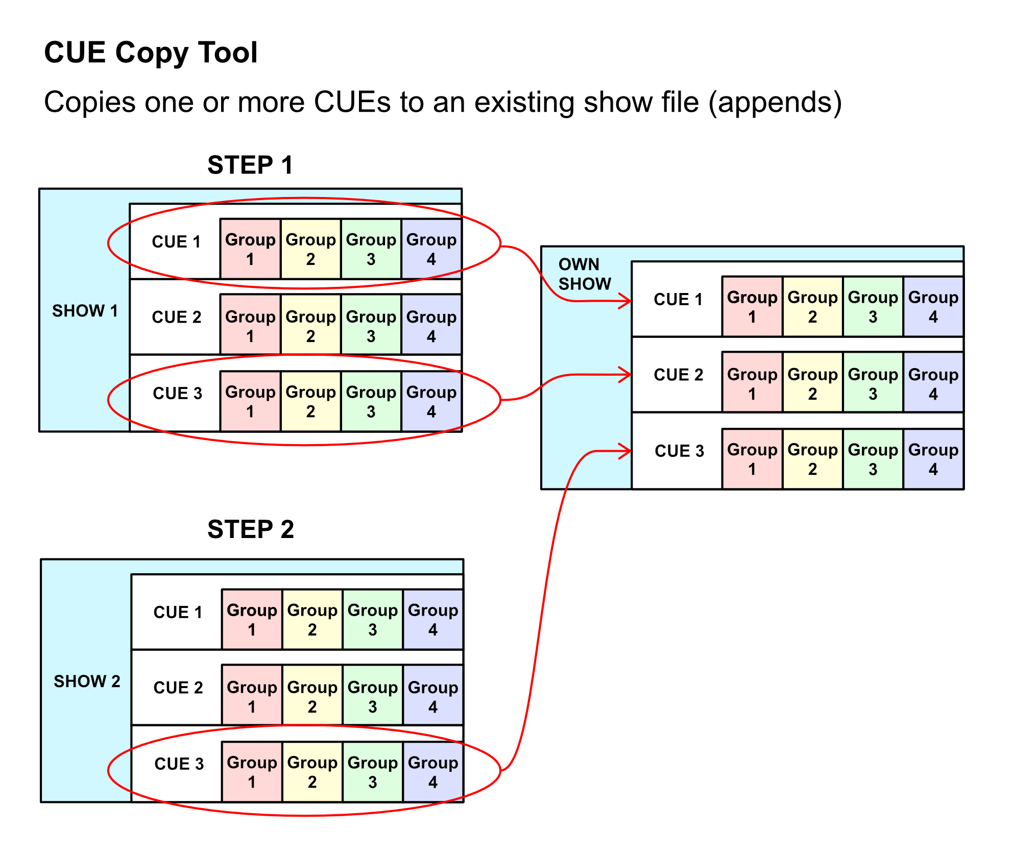 Damit kann man zb. Gruppen tauschen oder einzelne CUEs aus einer Show in eine andere kopieren.