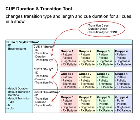 Mit diesem Skript kannst du für alle CUEs einer Show die Dauer und ggf. die Transition in einem Durchgang verändern.