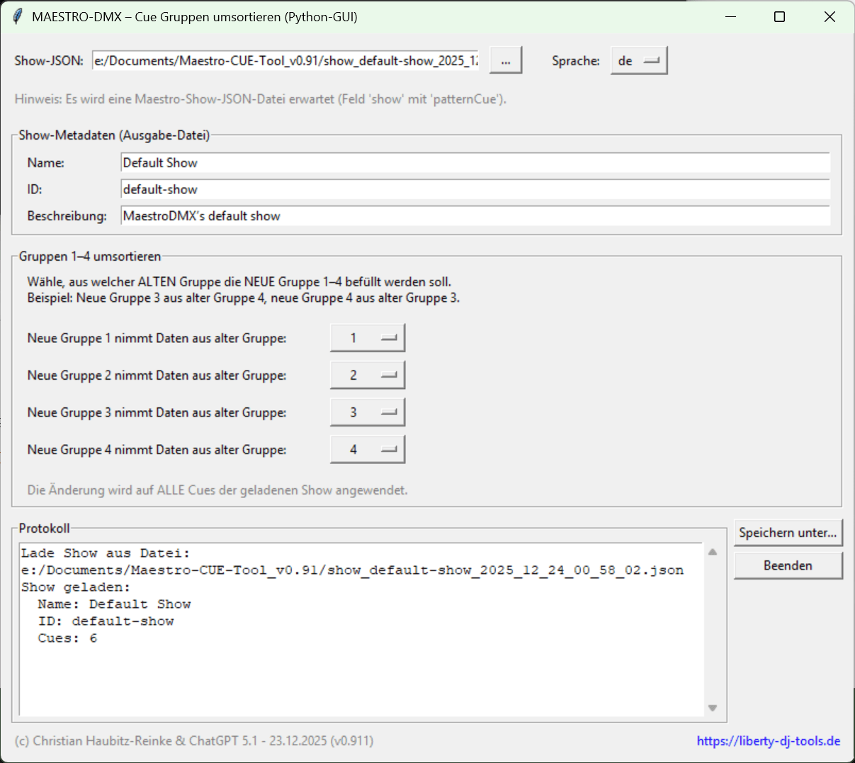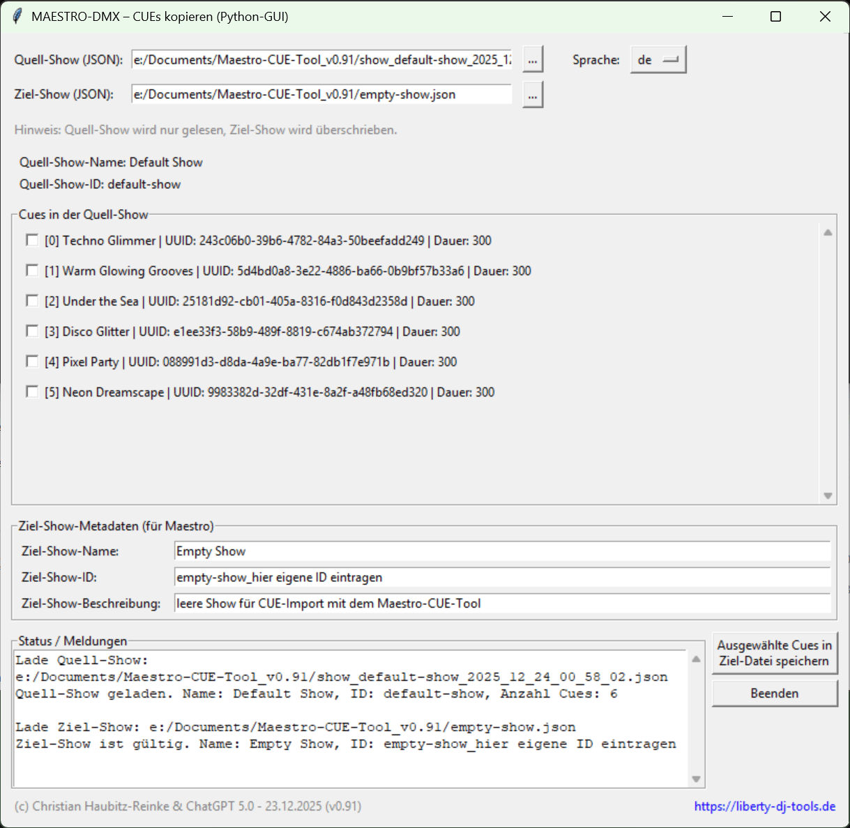 Dieses Skript erlaubt es, eine aus Maestro-DMX exportierte SHOW-Datei zu öffnen und die enthaltenen (eine oder mehrere) CUEs in eine andere Datei zu kopieren.