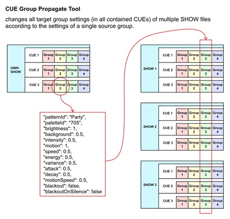 Mit dem Tool nimmst du dir eine fertig eingestellte Gruppe aus einer bestehenden CUE einer Show-Datei und öffnest einen Ordner mit allen zu ändernden Show-Files. Das Tool listet alle Show-Files zur Auswahl auf und du wählst nur noch, welche Dateien verändert werden sollen, und welche Ziel-Gruppe überschrieben werden soll. Das Tool öffnet alle ausgewählten Dateien und überschreibt in ALLEN enthaltenen CUEs die Zielgruppe mit den oben gewählten Einstellungen.