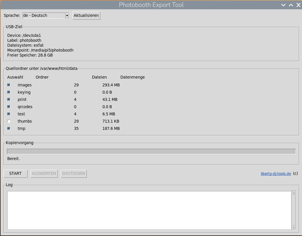 Das Tool findet den erstbesten USB-Stick und zeigt Name und Größe an. Das Tool ermittelt die in /data vorhandenen Ordner und zeigt sie mit Auswahlkästchen an. Man wählt die Ordner aus, die kopiert werden sollen. Spracheinstellung und Ordnerauswahl werden in der usb-sync.cfg gespeichert.